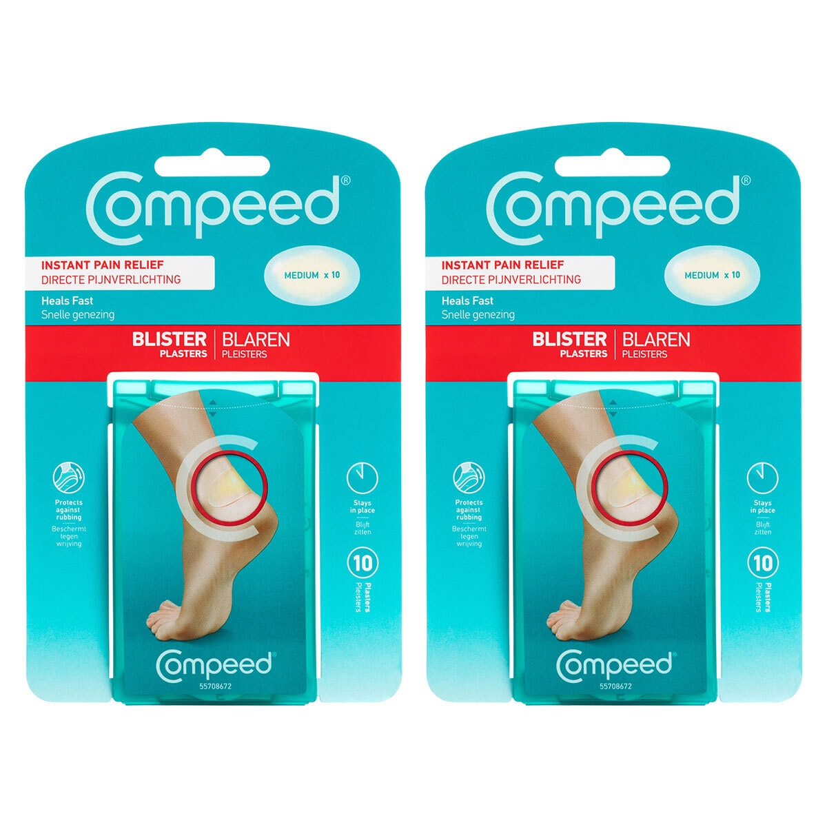 Compeed Blister Plasters provide instant pain relief. Whilst forming a protective cushion, the plaster absorbs excess moisture and provides optimum healing conditions for foot blisters. Compeed hydrocolloid technology is an active gel with moisture absorbing particles. Thick cushioning redistributes pressure from the blister to deliver instant pain relief. Compeed has a tapered edge so it contours smoothly with the skin’s surface. This reduces friction and ensures the healing process is not disrupted by painful rubbing.