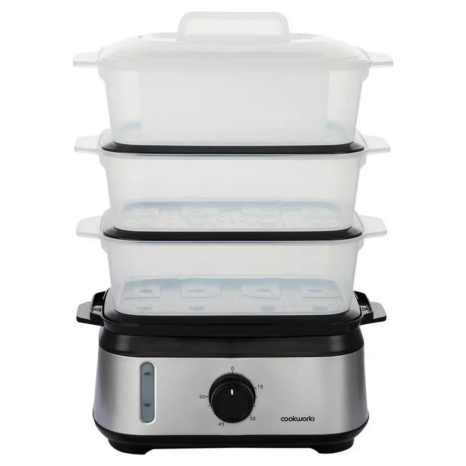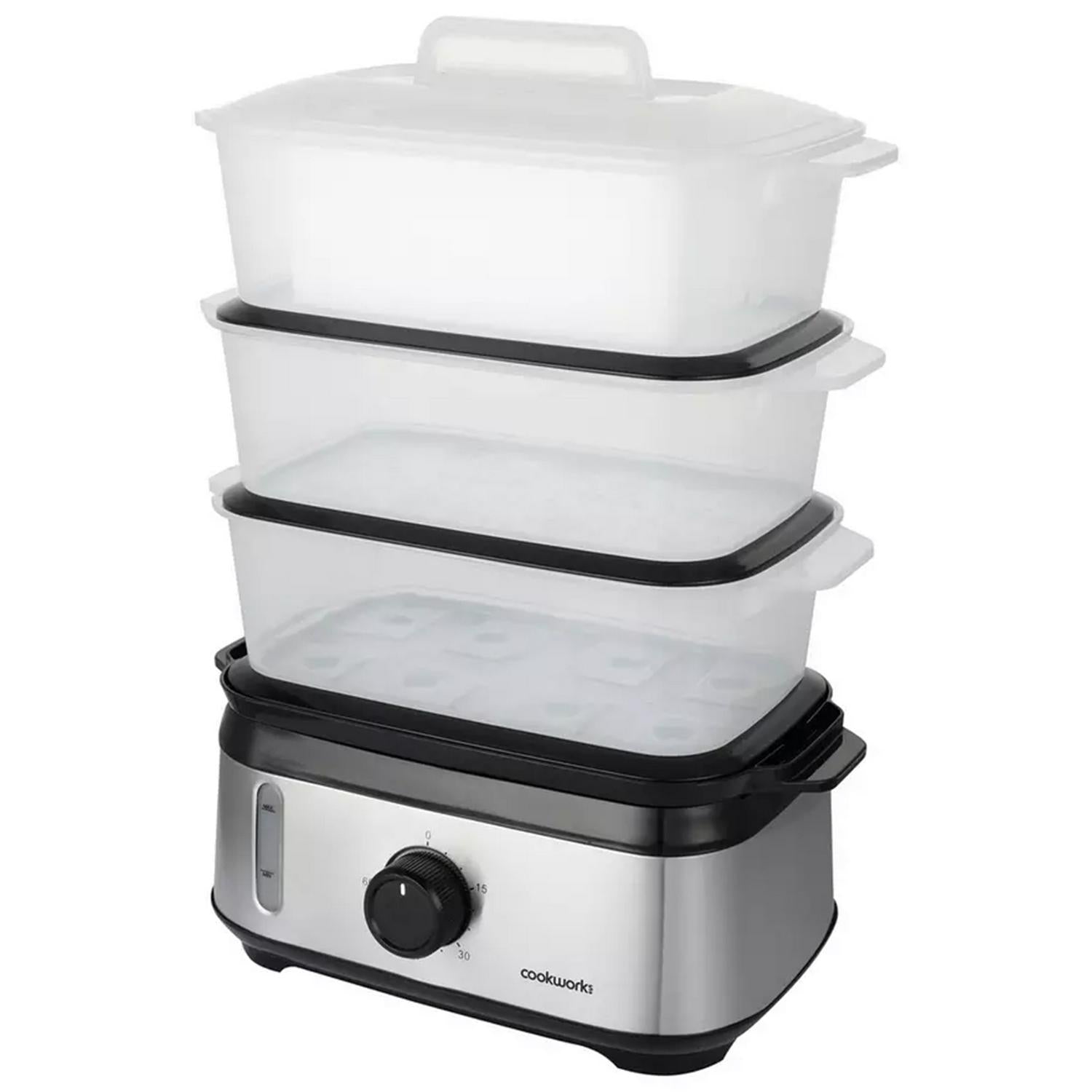 Read MoreFull steam ahead. We all know steaming veg and fish is a healthy, tasty way to cook. Well thanks to this nifty Cookworks machine it's also a doddle. With 3 separate tiers you can cook 3 different types of food at the same time. Other good stuff. It has a light indicator, a 60 minute timer, automatic switch off, and boil dry protection. Easy to keep clean. The basket grids are removable, and the bowls can be popped in the dishwasher.