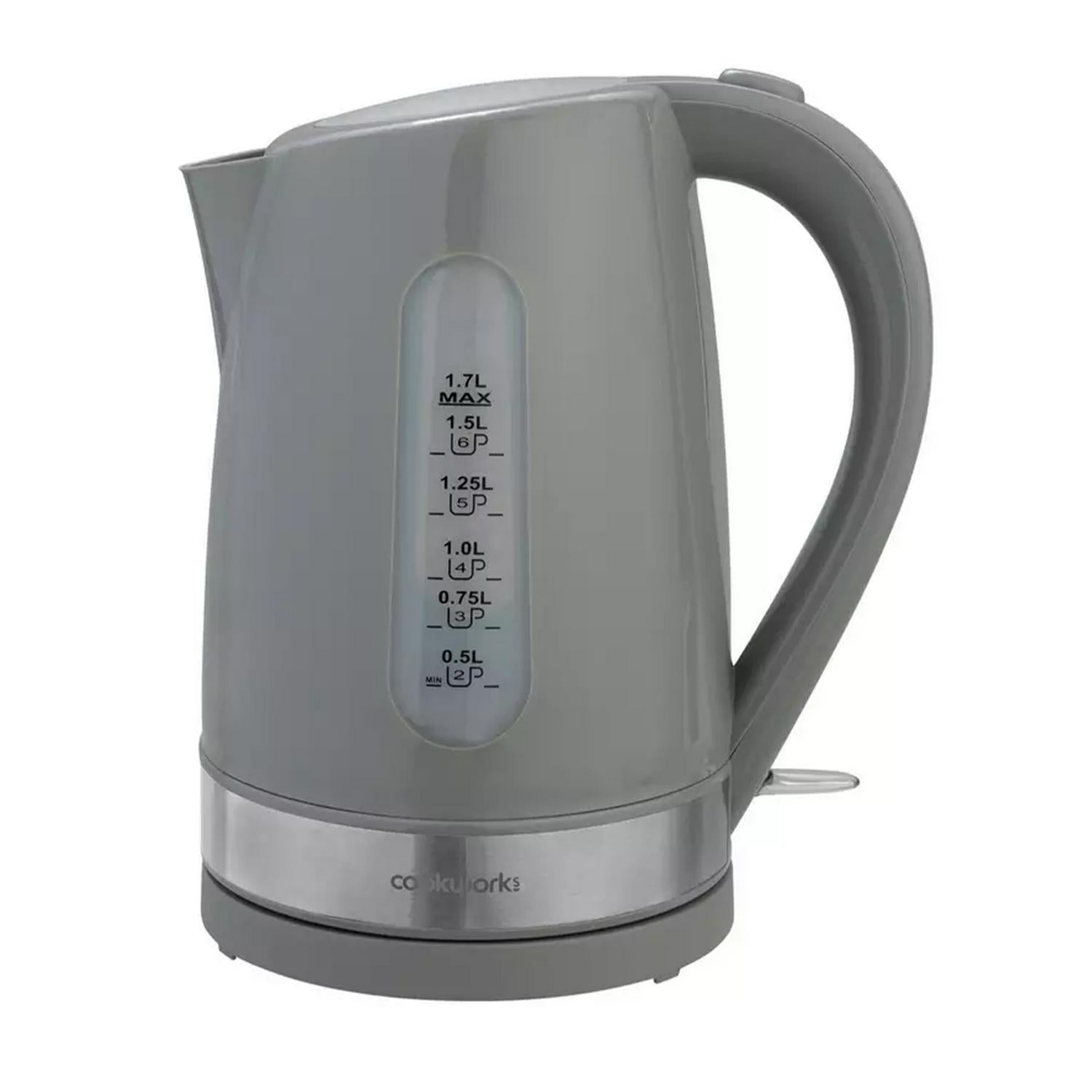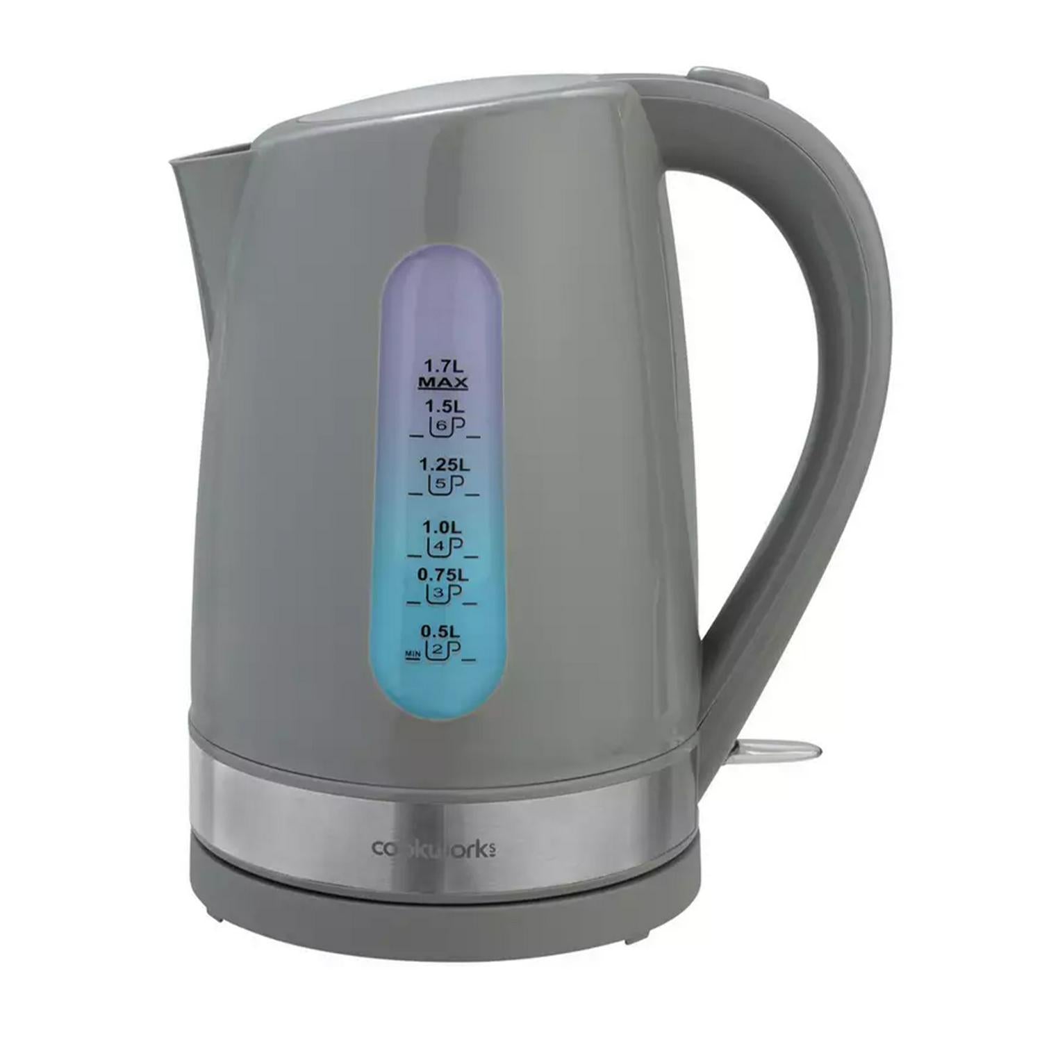 Read MoreEnjoy a quick cuppa with this grey Cookworks kettle. Get the teas in for visitors fast with the 1.7 litre capacity and the rapid boil. And the quiet boil feature means no disturbing sleeping beauties. Keep an eye on the water level with the illuminated water window. The boil dry protection and overheat protection will kick in and help prevent damage if it's turned on accidentally when empty. For added ease, it's cordless, so you don't have to worry about wires getting in the way.