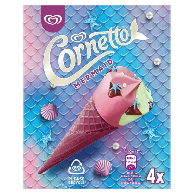 Product details Description Raspberry fruit ice and vanilla ice cream in a wafer cone (16%) with chocolate flavour coating (8%), raspberry sauce (7%) and biscuit and cereal pieces covered in white chocolate (3%). Get your hands on a Cornetto Mermaid Raspberry and Vanilla ice cream cone - a new dessert... Read More