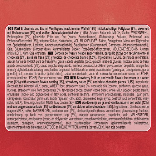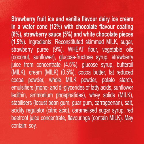 Strawberry Ice cream and vanilla flavour ice cream with strawberry sauce (5%) in a wafer cone (12%), with chocolate flavour coating (8%) and white chocolate pieces (1.5%)
