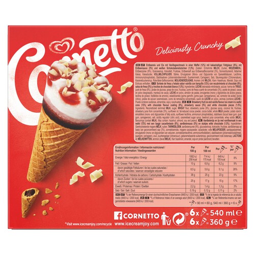 Read MoreThis Cornetto Strawberry ice cream cone is a tasty combination of a crispy baked wafer cone, coated inside from top to bottom with a chocolatey layer, combined with vanilla flavour ice cream, strawberry fruit ice and topped with strawberry sauce and white chocolate curls. For over 50 years we’ve been perfecting our Cornetto recipe, making sure the taste of every Cornetto ice cream is better than the last. This treat will take your taste buds on a delicious journey from the tasty white chocolate topping, through the strawberry sauce topped vanilla flavour ice cream and strawberry fruit ice, down to the crunchy wafer cone, ending with the legendary chocolatey tip. An Italian ice cream manufacturer from Naples was passionate about ice cream, loving smooth texture, delicious flavours and great ingredients. One day, they found a way to spread their passion for ice cream to everyone, creating a formula that could not fail. The great idea was to cover the inside of the cone with a chocolatey layer, allowing the wafer to keep its crispiness when filled with ice cream. From this breakthrough we have the Cornetto we know and love today. Each pack contains six tasty ice creams to be enjoyed as a snack, tasty treat or dessert and are guaranteed to be a favourite with family and friends. Find us on Facebook, Instagram and Twitter and let us know your favourite flavour!