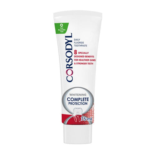 Read MoreCorsodyl Whitening Complete Protection goes beyond an ordinary toothpaste. It brings together the expertise behind our advanced gum toothpaste with all you need to help keep your teeth strong. With twice-daily brushing, Corsodyl Whitening Complete Protection Extra Fresh gives you 8 benefits for healthy gums and strong teeth: