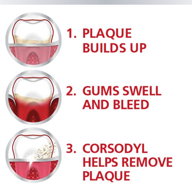 WHAT IS CORSODYL 0.2% MOUTHWASH?: Corsodyl 0.2% Gum Disease & Bleeding Gum Treatment Antibacterial Mouthwash is an oral medicine. It contains chlorhexidine digluconate for an effective gum disease treatment for adults, where gums may bleed when brushed.  WHY CHOOSE CORSODYL? When left untreated, gum disease is a major cause of tooth loss, so it is important to act fast at the first sign of gingivitis, including bleeding, red, or swollen gums. Thanks to the active agent chlorhexidine digluconate, Corsodyl 0.2% Mouthwash reduces the formation of dental plaque. It kills the leading cause of gum disease in 30 seconds* before it gets a chance to develop into irreversible periodontitis, the second stage of gum disease. This antibacterial mouthwash forms a protective layer over teeth and gums for up to 12 hours and maintains good oral health, managing oral thrush and denture sore mouth. It also promotes the healing of gums after dental surgery or treatment.WHAT DOES IT TASTE LIKE?: This medicated Corsodyl 0.2% Mouthwash comes in fresh mint flavour.*plaque bacteria in laboratory studies**when used as directedCorsodyl Original Alcohol Free Mouthwash contains chlorhexidine digluconate. For the treatment of gingivitis. Always read the label.1. Corsodyl 0.2% Mouthwash is a medicine containing chlorhexidine digluconate for the treatment of early signs of gum disease2. This medicated mouthwash is an effective gingivitis treatment, killing the main cause of gum disease in just 30 seconds*3. With triple-action efficacy, this Corsodyl mouthwash kills, repels, and lasts**4. Promotes good oral hygiene and healing after dental surgery or treatment, can be used as an aid to manage denture sore mouth, oral thrush or recurring mouth ulcers, and stops bleeding, swollen, and inflamed gums5. This anti-bacterial mouthwash in 300ml comes in fresh mint flavour6. A short-term intensive treatment to be used for no longer than 2-4 weeks, pour 10ml of Corsodyl Mouthwash, rinse for 1 minute, and then spit it out. Use twice daily.|Corsodyl 0.2% Mouthwash contains chlorhexidine digluconate. For the treatment of gingivitis. Always read the label.