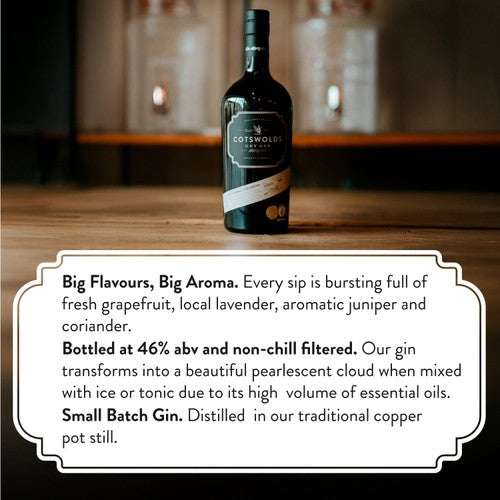 Read MoreOur award-winning Cotswolds Dry Gin is a delectable blend of nine carefully considered botanicals, including local lavender from the Cotswolds and freshly peeled pink grapefruit and lime zest. Due to the unusually high volume of botanicals we use, our gin causes a beautiful pearlescent cloud to appear when ice or tonic is added. A juniper-led gin with fresh citrusy notes and a hint of lavender.