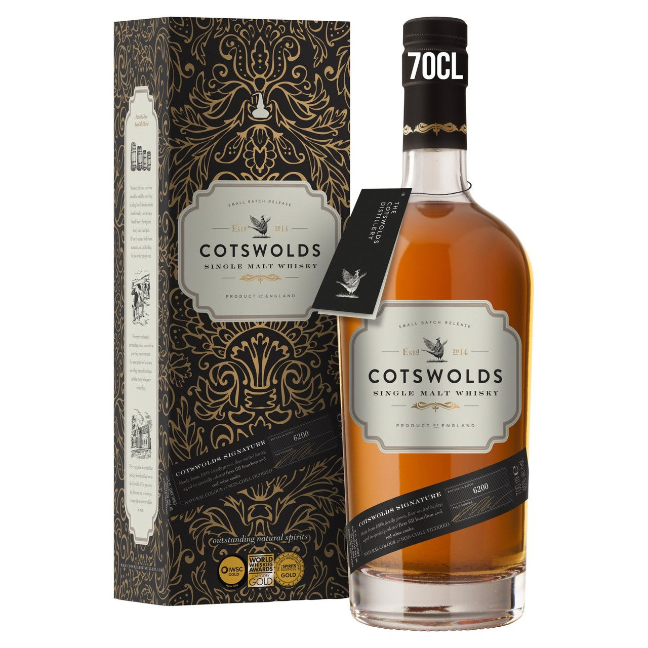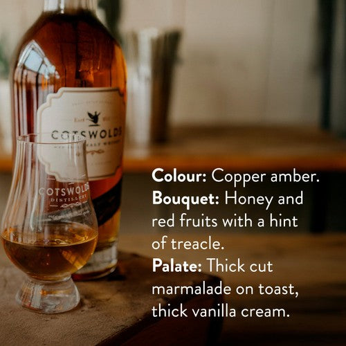 This award-winning Cotswolds Signature is a rich and fruity single malt whisky, the first produced entirely within the region. It is crafted using fine, locally grown, traditionally floor-malted Cotswold barley. The spirit is double distilled in traditional copper pot stills for quality character.