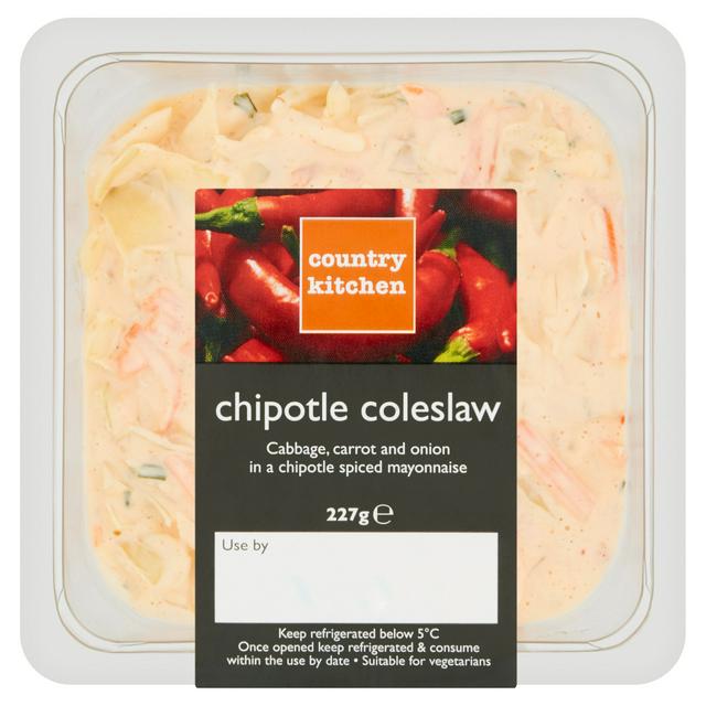 This Country Kitchen coleslaw features crisp shredded white cabbage, carrots, and onions mixed in a unique dressing. The mayonnaise base is spiced with chipotle chilli flakes, offering a smoky flavour dimension to the classic salad. This convenient 227g pot is suitable for vegetarians looking for an easy side dish.