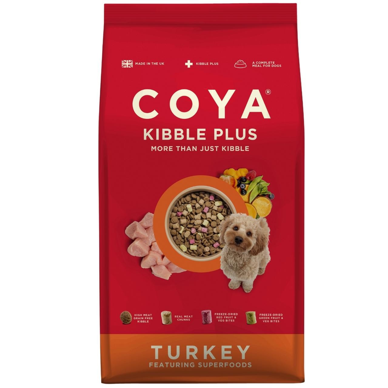 COYA Turkey Kibble Plus is formulated as a complete and balanced kibble designed for daily canine nutrition. This blend features a significant addition of freeze-dried turkey chunks alongside select freeze-dried superfood fruit and vegetable pieces. It provides an uncomplicated way for owners to slowly introduce the advantages of freeze-dried ingredients to their dog's regular diet.