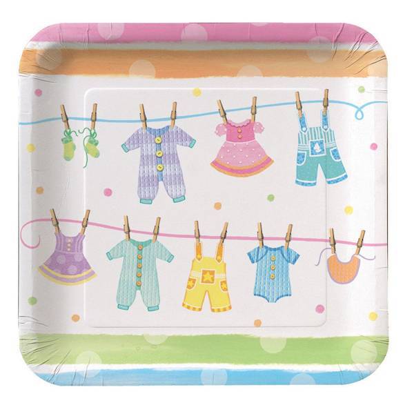 Material: Paper. Length: 7in. Design: Baby Clothes, Banner, Bib, Dotted, Printed, Socks, Square. Occasion: Baby Shower.