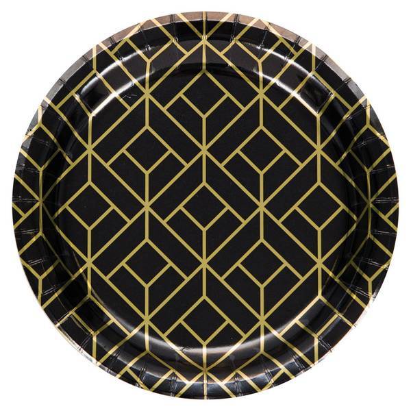 These disposable dessert plates are constructed from durable paper, supplied conveniently in a set of eight units for entertaining. They feature a contemporary geometric pattern enhanced with subtle foil detailing, offering a stylish option for serving light refreshments. The 7-inch circular format is specifically designed to accommodate smaller portions of cakes or sweets.