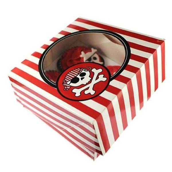 material paper width 16cm length 16cm height 75cm design contrast stripe skull and crossbones contents 4 insert card 2 cake box clear window removable packaging flat packed