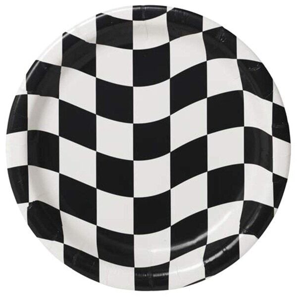 These Creative Party paper plates feature a distinct black and white checked design, ideal for racing or sporting themes. Constructed from reliable paper material, this pack of eight allows for simple serving and efficient post-event tidiness. Each round plate provides a 9-inch width, suitable for holding various food selections during your gathering.