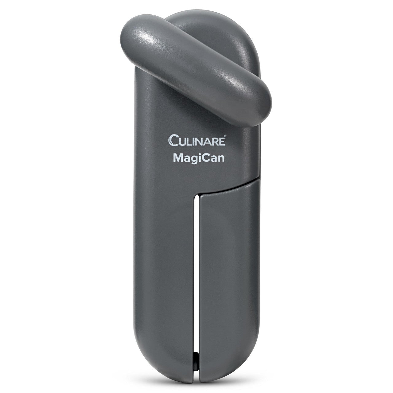 This Culinare grey Magican can opener features a durable, sharp stainless-steel cutting wheel suitable for most standard can sizes. Its operation involves attaching the opener, rotating the knob, and lifting the lid away safely. The robust handles are designed for comfort and a secure grip while operating this essential kitchen can opener.