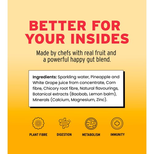 Read More- SAY HELLO TO A HAPPY, HEALTHY GUT* - Tropical Happy Gut has 3G Fibre in every can and a powerful blend of minerals and botanicals. - SUPPORT YOUR DIGESTION, METABOLISM & IMMUNITY* - Each can contains 15% of your daily recommended intake of Zinc, Magnesium & Calcium. - MADE BY CHEFS WITH REAL PRESSED PINEAPPLE & PASSIONFRUIT - Happy Gut Tropical has a light, smooth and refreshing flavour for all-day sipping. - NO ADDED SUGAR, NO ARTIFICIAL SWEETENERS, ALL NATURAL - with less than 10 calories per 100ml. - FOR THE PLANET - Born and made in the UK, we're a certified B Corp with a farm friendly supply chain. *Calcium contributes to the normal function of digestive enzymes. Magnesium contributes to normal energy-yielding metabolism. Zinc contributes to the normal function of the immune system.