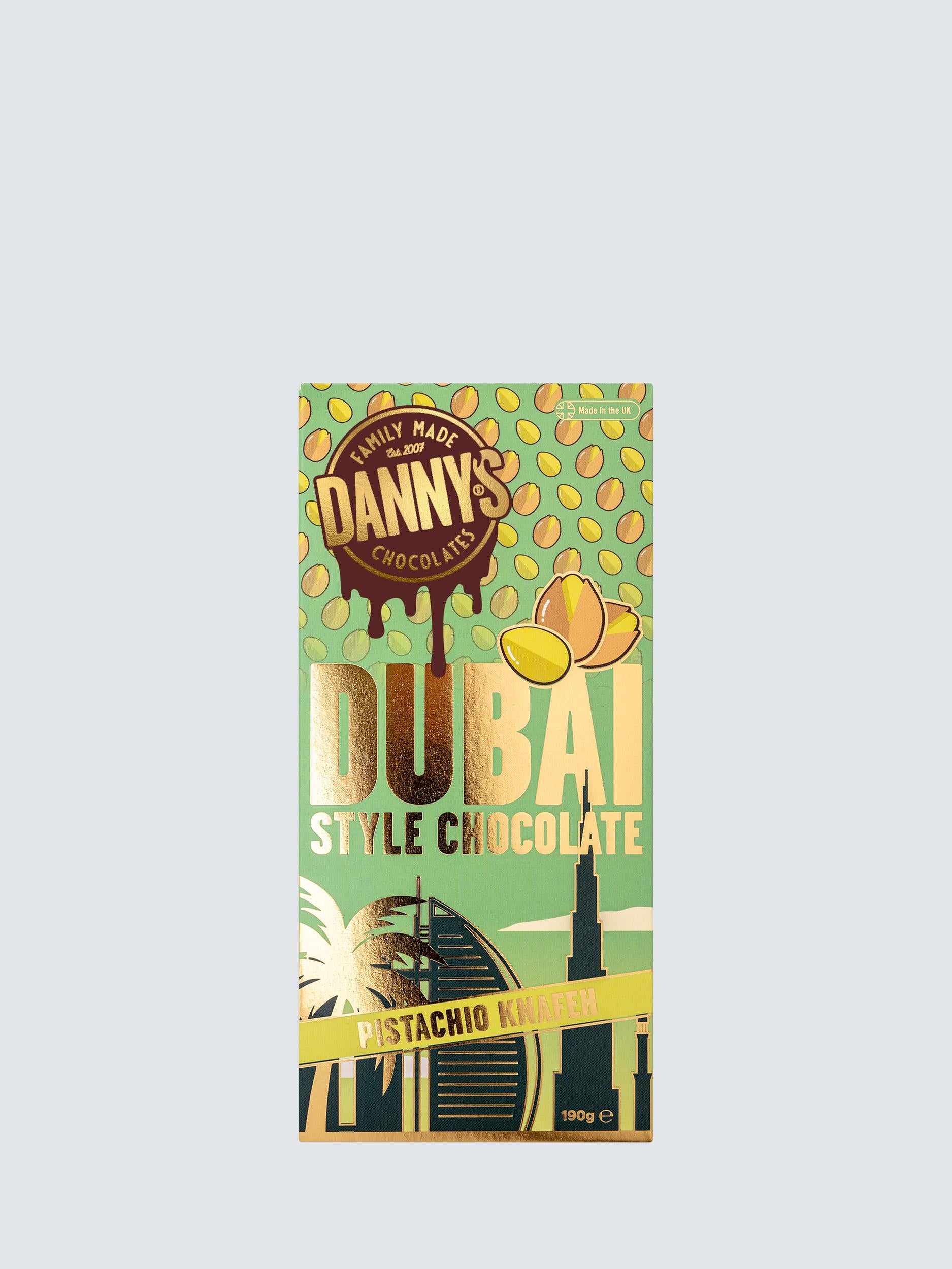 Danny's Chocolates offers the Dubai Style Chocolate Pistachio Knafeh, 190G. This gourmet bar features inspired layers of crispy knafeh pastry mixed with crunchy pistachios. This exquisite filling rests inside signature, rich Colombian chocolate, providing depth and texture. Find this exceptional family-crafted treat perfect for sharing or personal indulgence now.