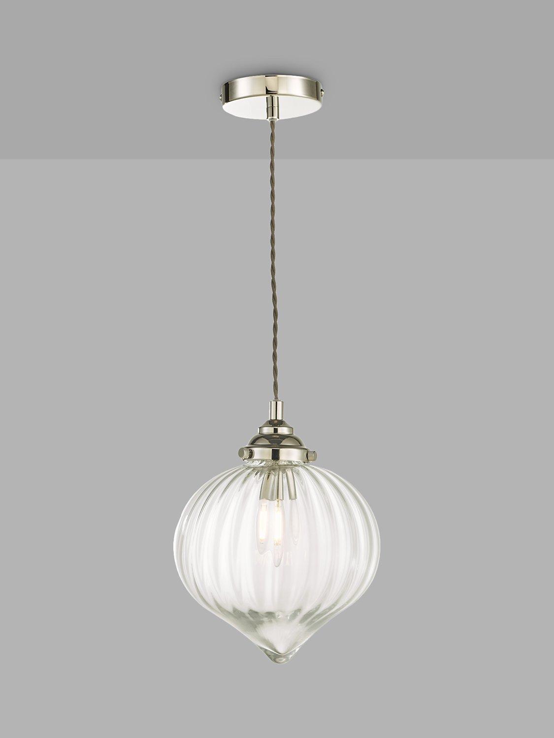 This Dar Mya Glass Ceiling Light offers elegant illumination for your modern interior space. It features a delicate teardrop design crafted from quality mouth-blown glass. The waterfall ribbing aids in diffusing the light evenly across your room. This pendant fixture is ideal for dining tables.