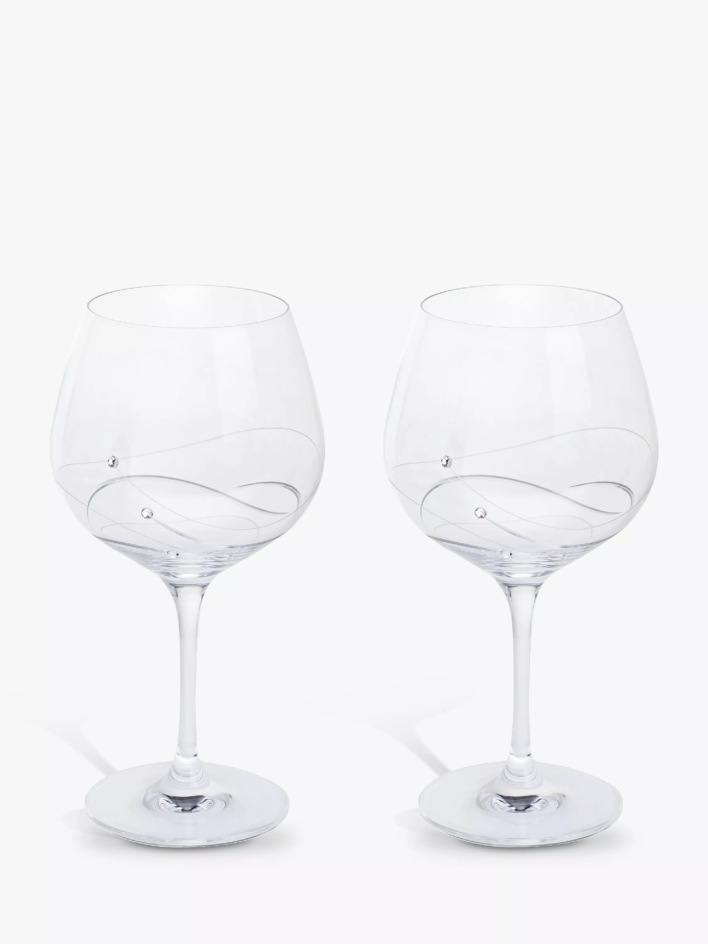 Enjoy a gin and tonic in bejewelled style with this pair of stemmed bowl glasses. The glasses incorporate real Swarovski mini-jewels and are engraved with a dynamic swirl effect.
