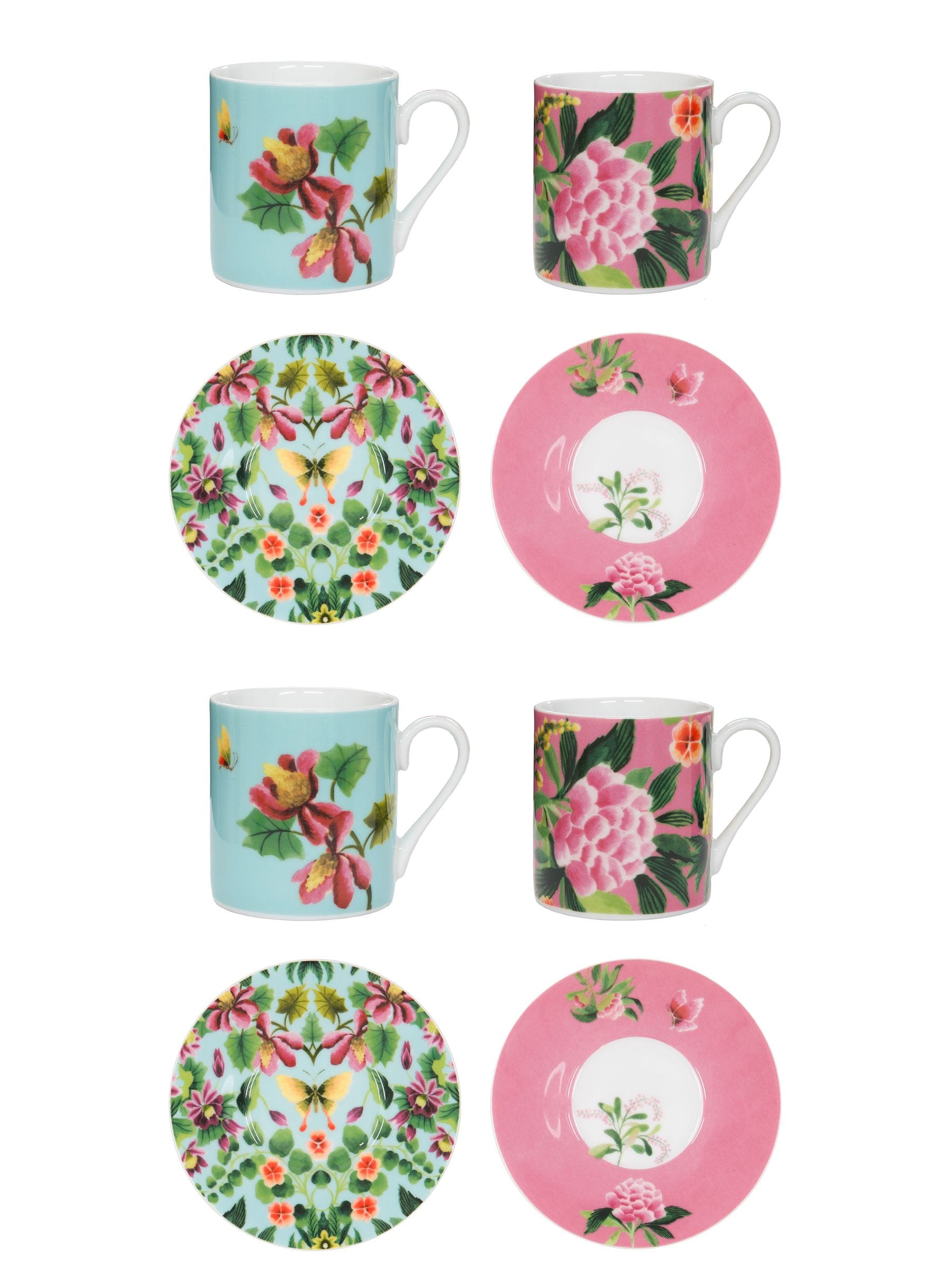 A stunning espresso cup and saucers set featuring our floral Ikebana design to add a touch of vibrant pattern and colour to your dining scheme. Two unique sets packaged in a decorative giftbox. Part of an exquisite range of luxurious contemporary porcelain tableware. Dishwasher and microwave safe. Espresso cup holds up to 90ml, saucer 12cm diameter.