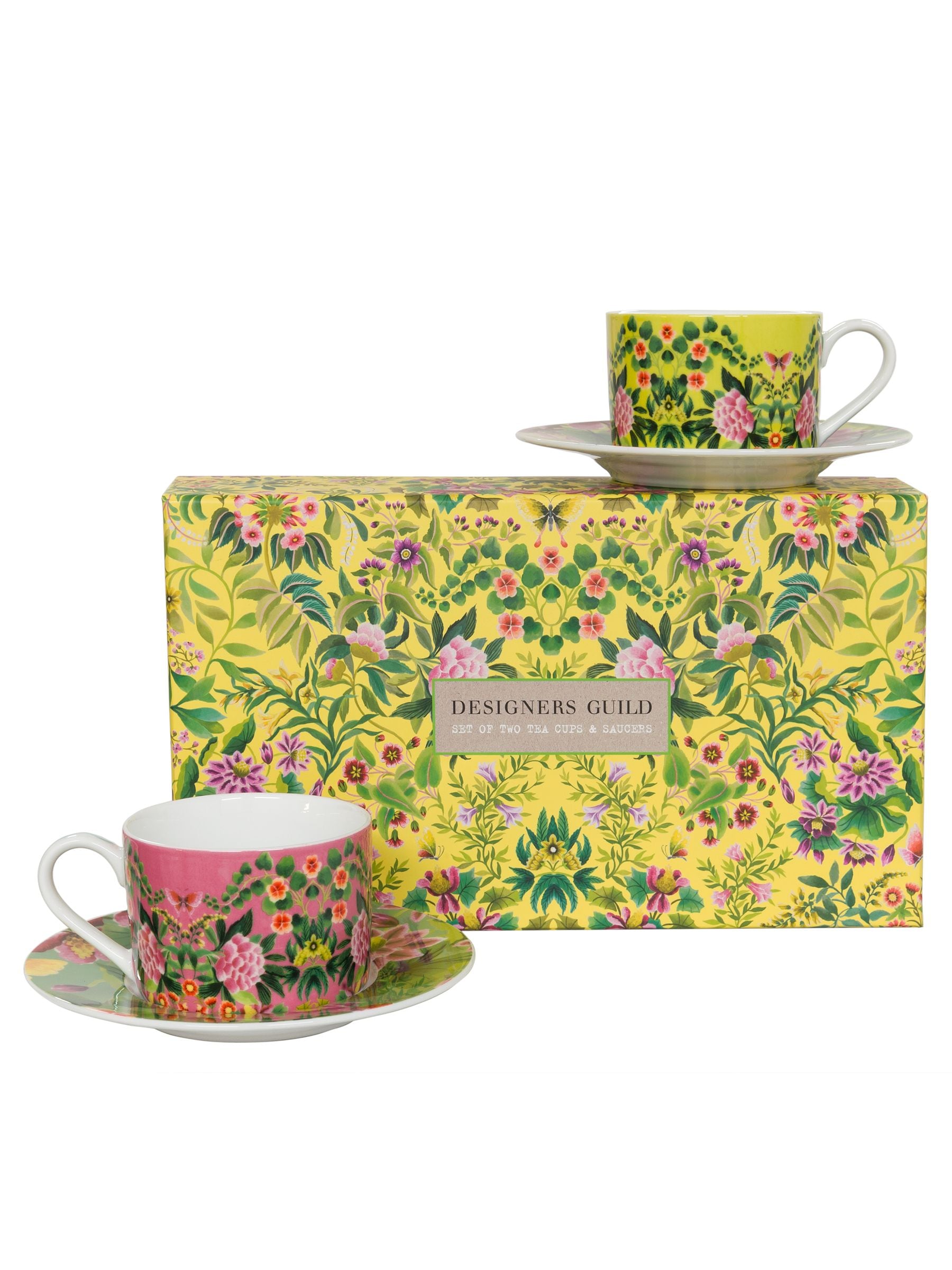 A stunning tea cup and saucer set featuring our floral Ikebana design to add a touch of vibrant pattern and colour to your dining scheme. Two unique sets packaged in a decorative giftbox. Part of an exquisite range of luxurious contemporary porcelain tableware. Dishwasher and microwave safe. Tea cup holds up to 220ml, saucer 15.6cm diameter.