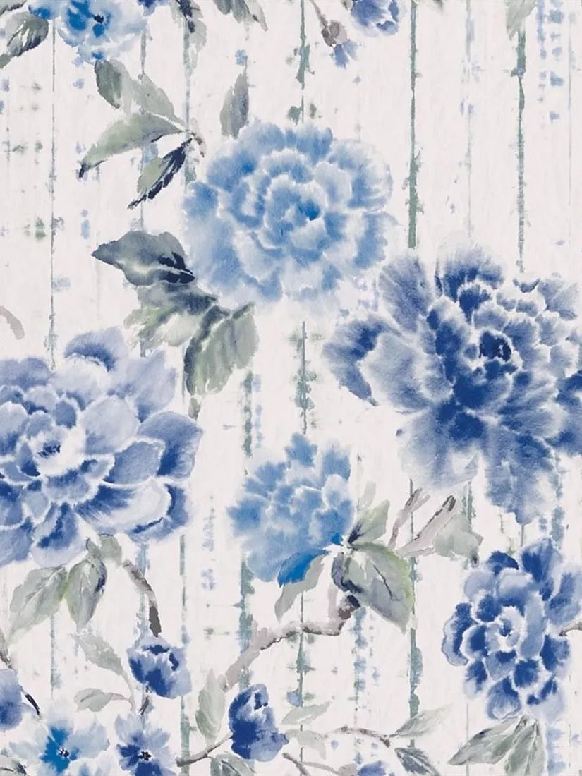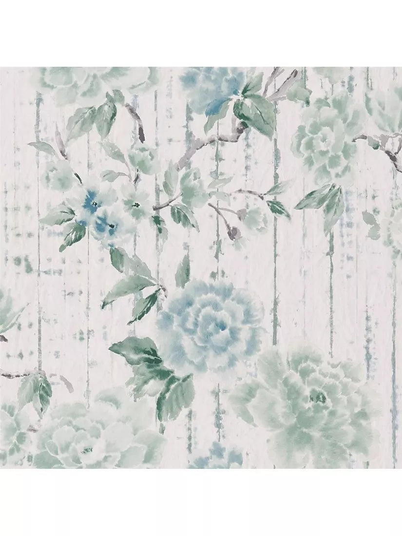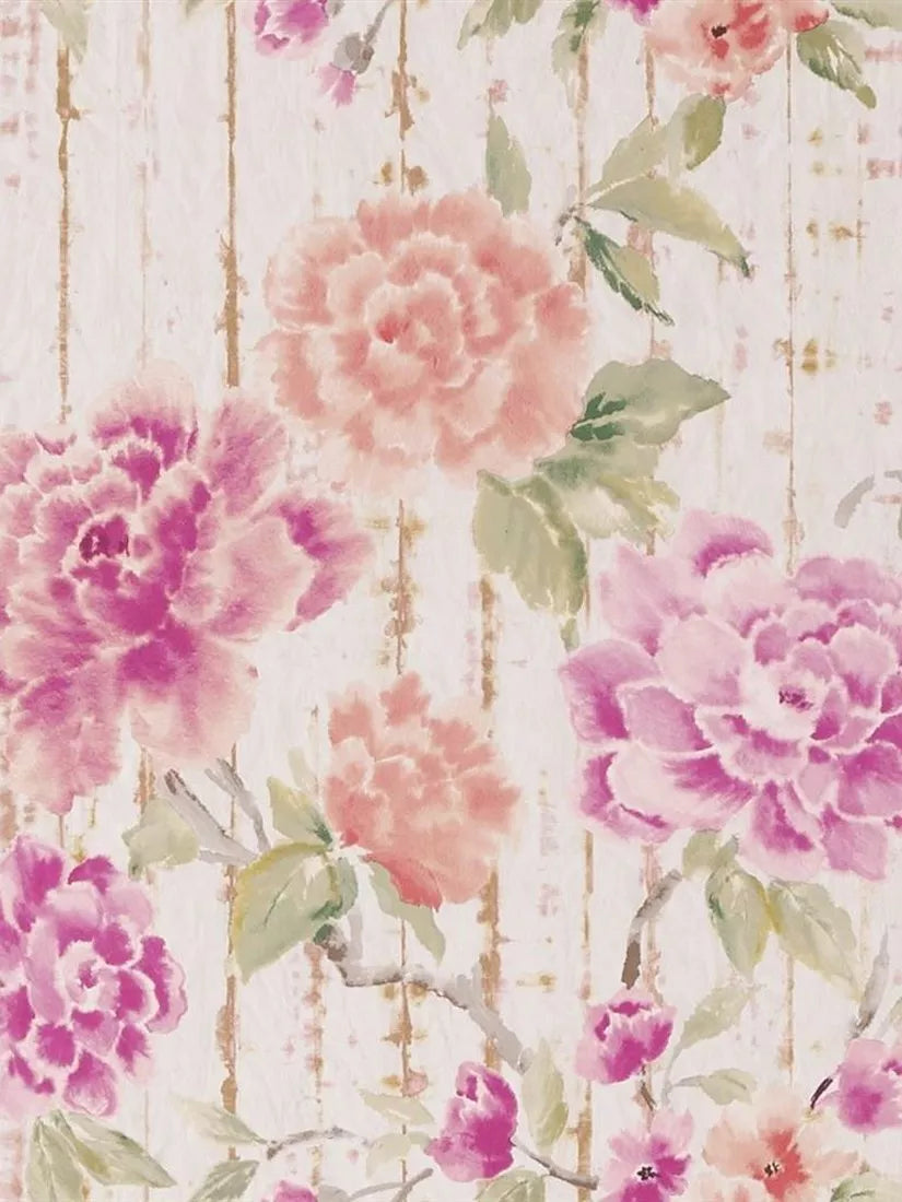 This sophisticated floral wallpaper features inky renderings of peonies and roses on a soft water-coloured striped ground, inspired by spring time blossom season in Kyoto. It's gravure printed onto a non-woven ground.