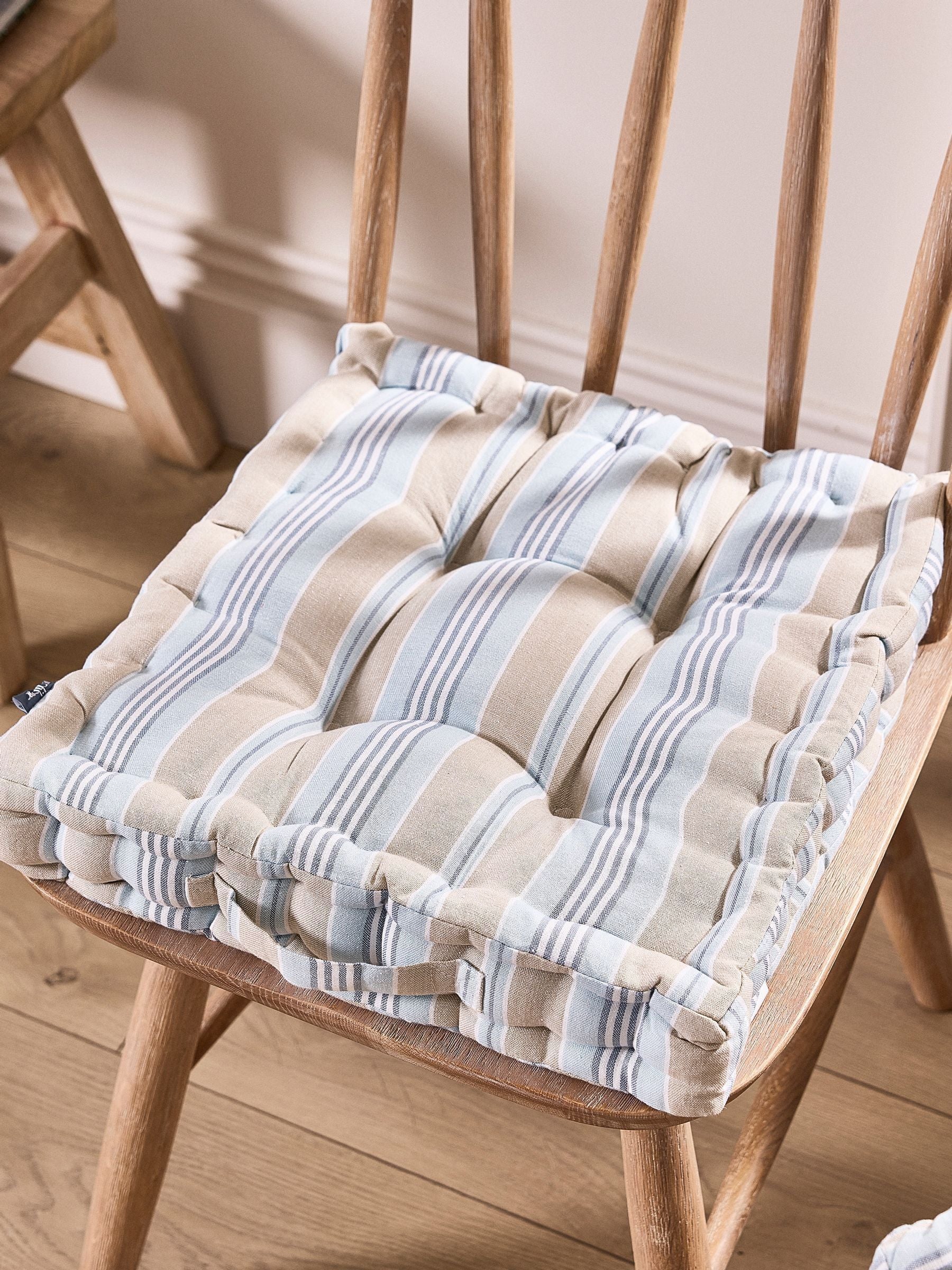 Bring a touch of style and comfort to your kitchen and dining room seating with this pair of extra padded cushions, boasting a vintage style striped print. The box cushion covers are made from cotton with a water-repellent coating to protect against spills and stains, and the interiors are generously padded with comfortable fibres which are anti-microbial and hypoallergenic. The 4 pintuck stitch quilting design offers reinforced security and premium quality. Boasting a rustic pattern of pastel blue stripes against a sand coloured background, these reversible mattress cushions are conveniently machine washable and complete with a carry handle. H8 x W40 x L40cm.