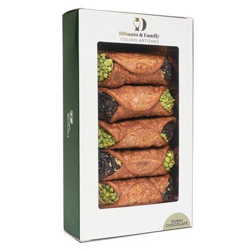 This creation blends Sicilian culinary tradition with modern elegance, inspired by Dubai. The dessert features a rich filling of Sicilian pistachio cream encased within a crisp cannoli shell.