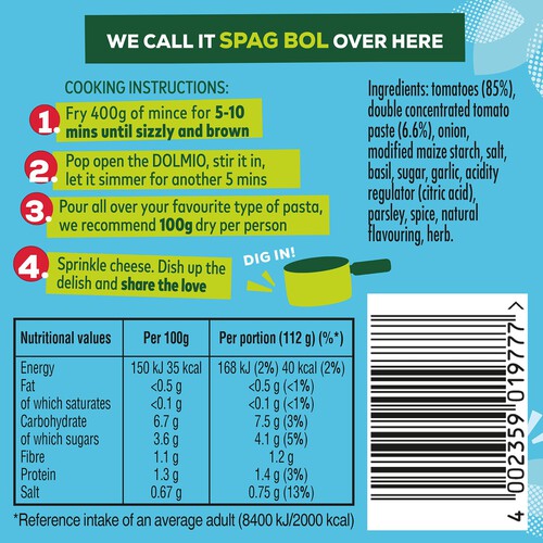 Read MoreDolmio sauce is the No1 Italian pasta sauce in the UK!* This Bolognese pasta sauce is a low fat version of the great Italian favourite - it's virtually fat free. It's made from a careful balance of ripe tomatoes, basilico fresco and a pinch of herbs and spices. This sauce contains no artificial colours, flavours or preservatives and helps you create a delicious, wholesome meal that can be enjoyed any day of the week. Follow your dreams not recipes! Why not try adding your favourite veg, or even chilli to spice things up? We call it spag bol over here! *Dolmio is the Nation’s favourite Italian Wet Cooking Sauce - based on Nielsen RMS sales data for the 12month period ending 05.04.2023 (Copyright © 2023, Nielsen).