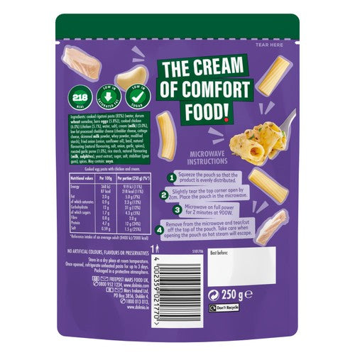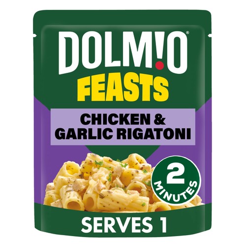 DOLMIO Feasts Chicken & Garlic Rigatoni delivers a substantial single-serving pasta meal for one, combining tender chicken and perfectly cooked egg rigatoni. This convenient pouch features a creamy sauce that is infused deeply with garlic flavour for a rich taste experience. Ready to eat in just two minutes from the microwave, it suits busy schedules effectively. It is a satisfying option for lunch or a swift evening dinner preparation.