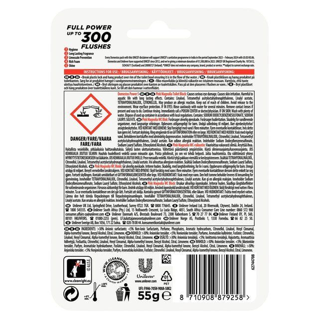 Struggling to keep your toilet smelling good and looking clean? Discover the Domestos Power 5 Magnolia Toilet Rim Block, your solution to a clean and fresh toilet flush after flush with a long-lasting fragrance that lasts for up to 300 flushes. This powerful toilet freshener provides you with not 1 but 5 key benefits:1. Keeps your toilet hygienically clean 2. Long-lasting fragrance 3. Limescale prevention 4. Rich foam 5. Shine.How to use: Simply unfold the hanger, break the plastic lock and hang over the toilet rim ensuring itâs in the flow of water. Use Domestos toilet cleaner and Power 5 block together for an unstoppable germ-free, fresh-scented, sparkling clean toilet. The product is also available in Lime, Ocean and Lavender. Domestos is the UKâs #1 toilet cleaner brand*, renowned for protecting families against germs and committed to combatting poor sanitation worldwide, helping millions of people gain access to clean and safe toilets. Support our work by expanding your cleaning arsenal with Domestos products. Enhance your cleaning routine with the full Domestos range: Bleach, Power Foam, and Power Fresh for a sparkling clean bathroom. *2023 NIQ data, Value / Unit Sales, Household Cleaning â Toilet & Bleach w/e 04.11.2023