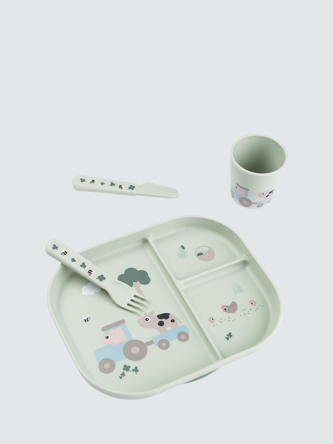 Dinner set including a 3-section compartment plate, knife, fork and mini mug.