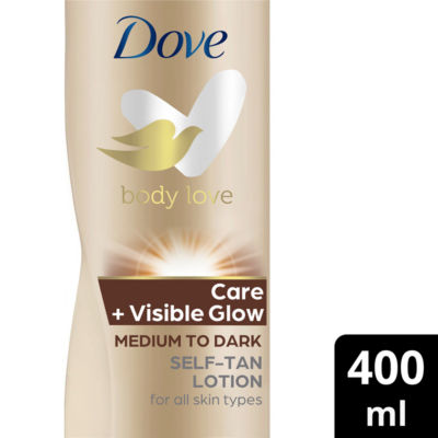 Product InformationDove Visible Glow Self-Tan Medium to Dark Body Lotion helps build a gradual tan that gives the skin a natural-looking, sun-kissed radiance. Globally, Dove does not test on animals and we have joined forces with PETA to create a Limited-Edition pack design that celebrates our joint commitment to help bring an end to animal testing. Rich yet fast-absorbing, this nourishing self-tan body lotion melts into your skin for a healthy-looking summer glow Containing the unique NutriDuo Complex with skin-natural nutrients, this moisturising self tanning body lotion nourishes your skin deep* down Limited Edition - Subject to Availability Globally, Dove does not test on animals. We have joined forces with PETA to create a Limited-Edition pack design, available on some of our bestselling products, that celebrates our joint commitment to help bring an end to animal testing. Through our efforts we aim to raise awareness of our support for a global ban on animal testing for cosmetics and invite others to join us. Want to keep your healthy-looking summer radiance for longer, without exposing your skin to the sun? Bask in Dove Visible Glow Medium to Dark Self-Tan Lotion and treat yourself to that holiday glow all year round. But just how does this gradual tanning lotion give you glowing skin and a natural-looking tan? While the gradual tanning agents in the self-tan lotion build sun-kissed colour, you're moisturising your skin, too. A multitasking lotion that creates a sun-kissed glow while caring for your skin, this nourishing body lotion is enriched with the unique Dove NutriDuo Complex, a blend of skin-natural nutrients and rich essential oils. Quickly absorbed, the body lotion hydrates deep* down and leaves skin feeling soft and moisturised. This moisturising tanning lotion is a subtle and nourishing way to build a natural-looking tan. Simply keep your glow topped up by applying this self-tan lotion every day. To get the best from this tanning lotion, start by exfoliating your skin, as a smooth surface will help you achieve a more even finish. Massage the lotion evenly over clean, dry skin using circular motions. Before getting dressed, allow the body lotion to absorb into your skin. Once you're finished, remember to wash your hands. Planning on spending time in the sun? Apply a separate sunscreen product over the top once this lotion has soaked in and your skin is dry. For a sun-kissed look all year round and sumptuously soft skin, reach for this sunshine-in-a-bottle tanning lotion to add a summer glow, whatever the weather. Dove believes no young person should be held back from reaching their full potential. Since 2004, Dove has been building self-esteem and confidence in young people - and by 2030, it will have helped a quarter of a billion young people through its educational programmes and resources. *Within the stratum corneum