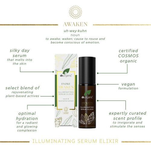 Uplift your mind and awaken your complexion with this illuminating day serum from the Dr Organic EVOKE range. This formula is designed to add nourishment and radiance to your essential morning routine. EVOKE offers a holistic beauty approach by stimulating both body and mind through luxurious textures and scents.