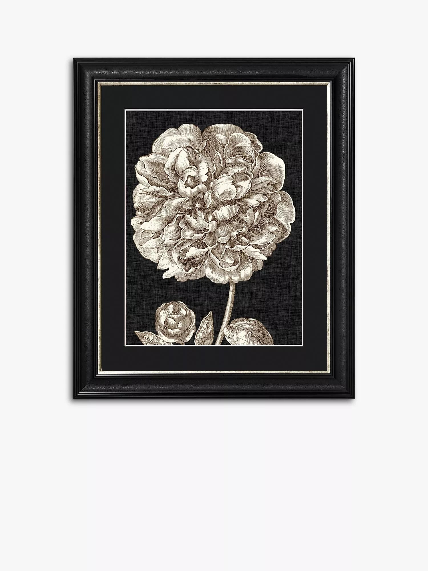 A detailed illustration capturing the intricate beauty of the peony flower, printed on satin photo paper and framed in an antique pewter moulding. The frame is made of a recycled wood composite and comes with a black mount and core.