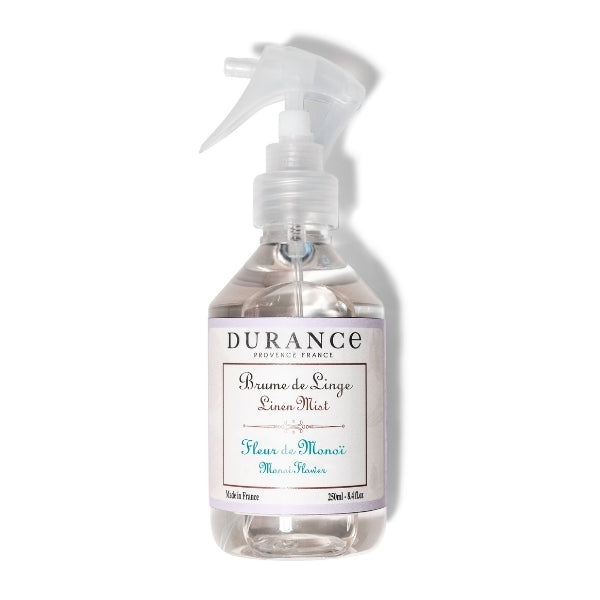 durance linen mist mono flower 250ml luxury french home fragrance exotic tropical handcrafted in provence a sweet and sensual fragrance with the essence of mono flower transport your home to a tropical paradise with the lush and exotic scent of mono flower this luxurious linen mist crafted in provence using highquality ingredients and expert french perfumery techniques infuses your linens fabrics and living spaces with a captivating fragrance the tropical notes of mono combined with hints of coconut and frangipani create a warm sensual atmosphere simply spritz onto your linens and enjoy the longlasting sweet fragrance that evokes the essence of sunkissed beaches and floral blooms fragrance profile top notes coconut frangipani a creamy tropical opening that excites the senses heart notes mono flower jasmine a sweet and exotic floral heart reminiscent of island blooms base notes vanilla soft woods a warm and comforting finish that lingers gently key benefits longlasting fragrance infuses linens fabrics and living spaces with a sweet tropical aroma versatile use ideal for pillows bedding curtains upholstery and any fabric in your home crafted by expert perfumers developed in collaboration with master perfumers from grasse for an authentic highquality scent ecofriendly sustainable packaged in a recyclable bottle for minimal environmental impact refreshes revitalizes revives the scent of your linens and fabrics creating a luxurious and exotic atmosphere how to use shake the bottle gently before use lightly spritz the mist onto your linens fabrics or in the air to refresh your space allow a few moments for the fragrance to settle and infuse the fabrics indulge in the tropical allure of mono flower and let its sweet exotic notes transport your home to a serene island escape adding warmth and luxury to every room