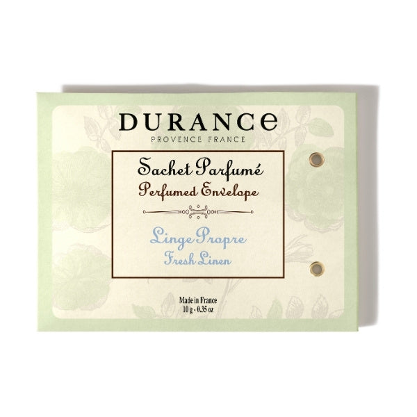 durance perfumed envelope fresh linen 10g luxury french home fragrance delicately scented sachet handcrafted in provence a crisp and clean fragrance inspired by freshly laundered linen infuse your home with the fresh airy scent of freshly laundered linens with this beautifully perfumed envelope the delicate fragrance of fresh linen evokes the comforting feeling of crisp sheets drying in a gentle breeze under the warm provenal sun expertly crafted using traditional french perfumery techniques it offers a longlasting and natural fragrance that transforms your space into a serene and inviting retreat fragrance profile top notes fresh aldehydes light citrus a clean and refreshing opening that lifts the senses heart notes cotton flower white musk a soft powdery floral heart that enhances the clean freshness base notes light woods soft amber a gentle comforting finish for a serene ambiance key benefits longlasting fresh fragrance infuses linens clothing and small spaces with a crisp fresh scent versatile use ideal for wardrobes drawers suitcases cars or anywhere you desire a clean refreshing aroma crafted by expert perfumers developed in collaboration with master perfumers from grasse for an authentic and highquality scent ecofriendly practical made with natural fragranceinfused granules and packaged in a recyclable envelope how to use place the perfumed envelope in your wardrobe drawers or luggage shake lightly from time to time to reactivate the fragrance avoid direct contact with fabrics to prevent staining indulge in the crisp and comforting scent of fresh linen and let its soft clean notes bring a sense of purity and tranquility to your home