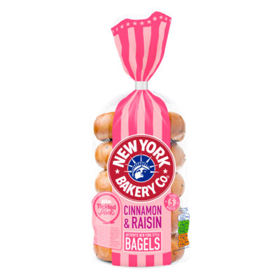 Enjoy five New York Bakery Co Cinnamon Raisin Bagels, weighing 425g net, perfect for pairing with your morning coffee. These baked goods are naturally low in fat and suitable for vegan and vegetarian diets. The flavour profile balances sweet raisins with warm cinnamon and mixed spice notes for a comforting taste experience.