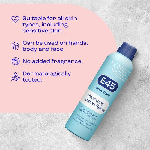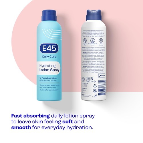 This E45 Daily Moisturiser Spray provides effective hydration with a fast absorption formula for quick use. Its light consistency ensures easy application across larger areas of skin that require immediate relief. It is specifically formulated for the daily care of dry and sensitive skin types needing dependable moisture.