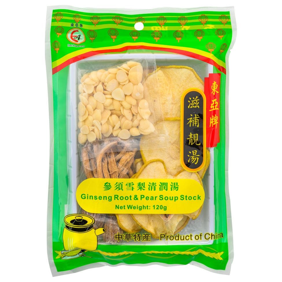 The Ginseng Root & Pear Soup Stock, known as \\u53c3\u9808\u96ea\u68a8\u6e05\u6f64\u6e6f,\ is a harmonious blend that brings together the robust goodness of ginseng, the natural sweetness of pear, and other carefully selected ingredients to create a nourishing and refreshing soup. This traditional soup stock is prized for its potential health benefits. Ginseng, revered in traditional Chinese medicine, is believed to boost energy, enhance vitality, and support overall well-being. Paired with the natural sweetness of pear, this soup stock delivers a delightful balance of flavors. To prepare this wholesome soup, simply combine the Ginseng Root & Pear Soup Stock with your choice of meat or vegetables, allowing the rich essence of ginseng and the sweetness of pear to infuse into the broth. Whether enjoyed as a comforting soup on its own or as part of a nourishing meal, this soup stock offers a delicious and healthful culinary experience. Embrace the tradition and goodness of Ginseng Root & Pear Soup Stock for a taste of holistic wellness.