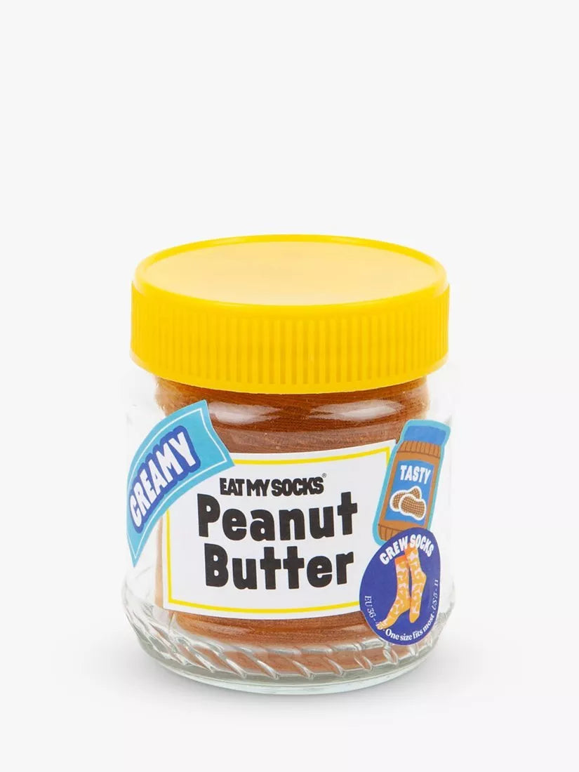 A cosy pair of socks snugly packed within a familiar peanut butter jar makes for an unexpected and delightful gift.