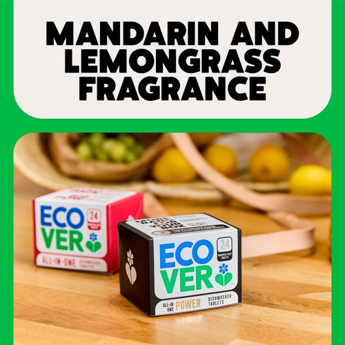 Achieve squeaky clean dishes with Ecover All-In-One Power Dishwasher Tablets, now featuring a formula enhanced for superior cleaning performance. These tablets utilize a biodegradable composition and a refreshing mandarin and lemongrass fragrance for your kitchen.