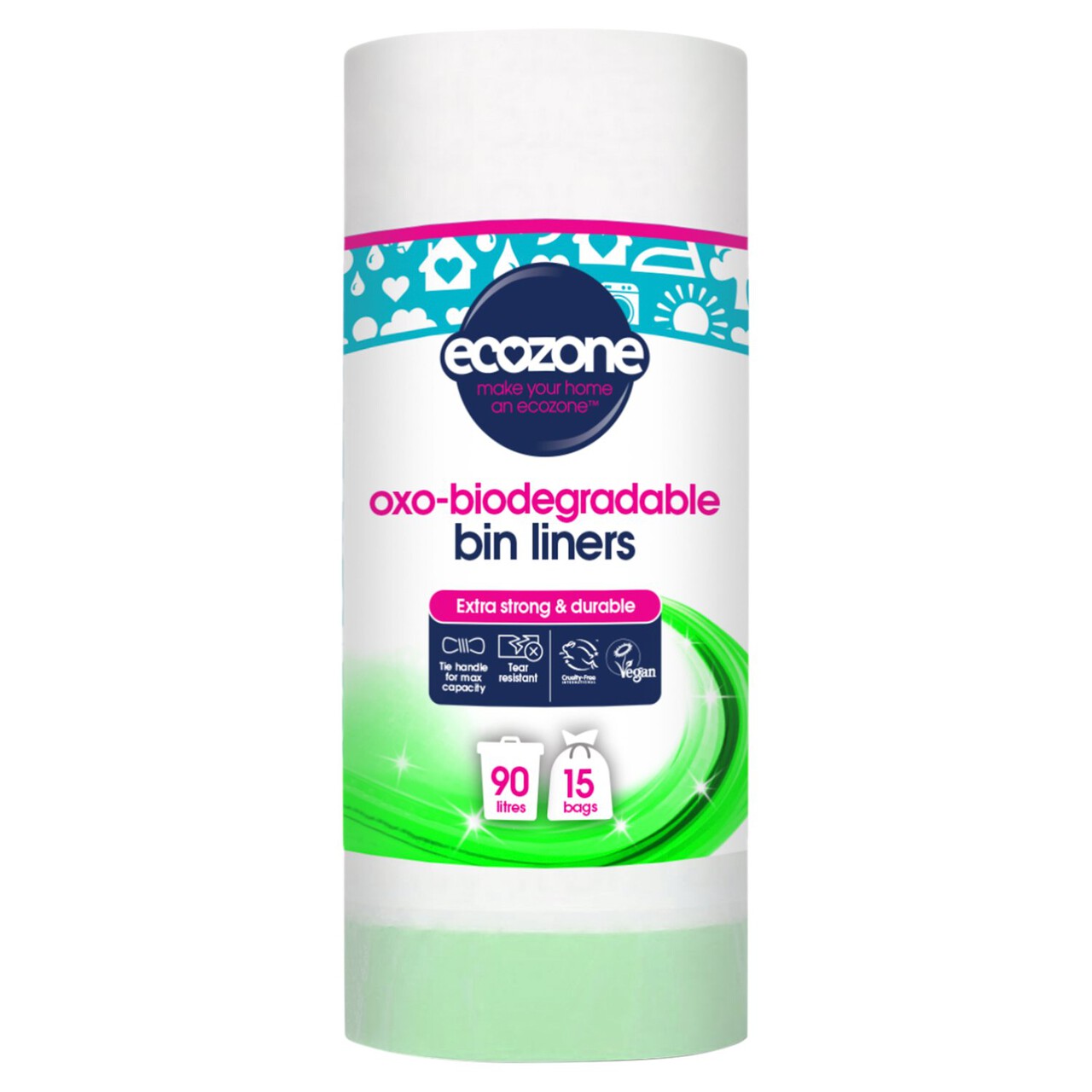 - Oxo-biodegradable bin liners for 90L household bins.- Tear resistant even when wet.- Designed with tie top handles for maximum capacity.More about our Bin LinersEcozone's Oxo-Biodegradable Bin Liners are created with special oxo-biodegradable materials that also make them compatible with general recycling. The liners are extra-strong & tear-resistant even when wet. They have been designed with a tie top drawstring handle for maximum capacity & easy handling.