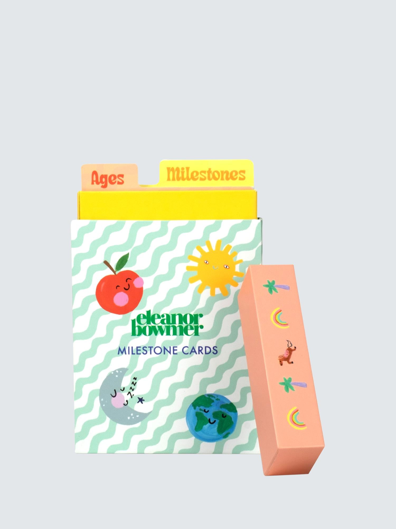 A set of 24 milestone baby cards that include ages from 1 month to 1 year, and milestones such as first smile, first steps, rolled over, first Christmas. Designed by Eleanor Bowmer in a printed gift box.