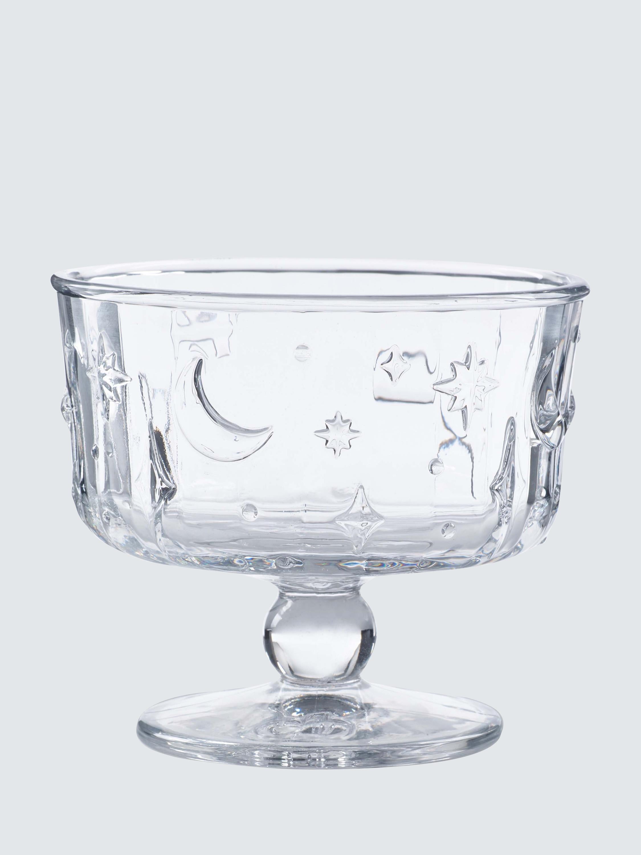 Four pressed glass dessert bowls designed with lips, moon and stars icons from Eleanor Bowmer's signature Electric Coast collection.
