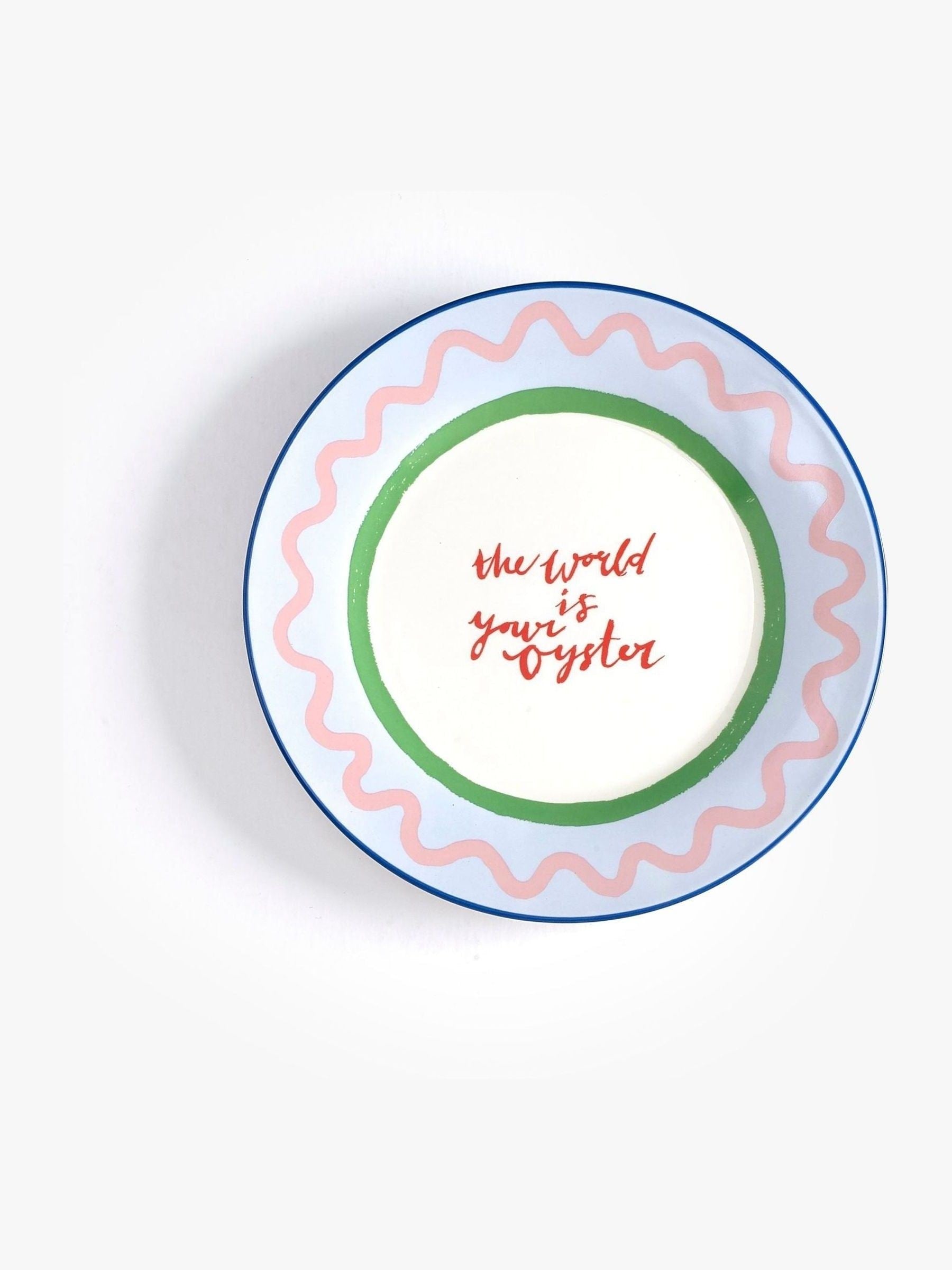 Introducing the pearl-fect new addition to your dinnerware collection. From British designer Eleanor Bowmer, the Electric Coast side plate features hand-illustrated squiggle designs and is complete with a The World is Your Oyster slogan.