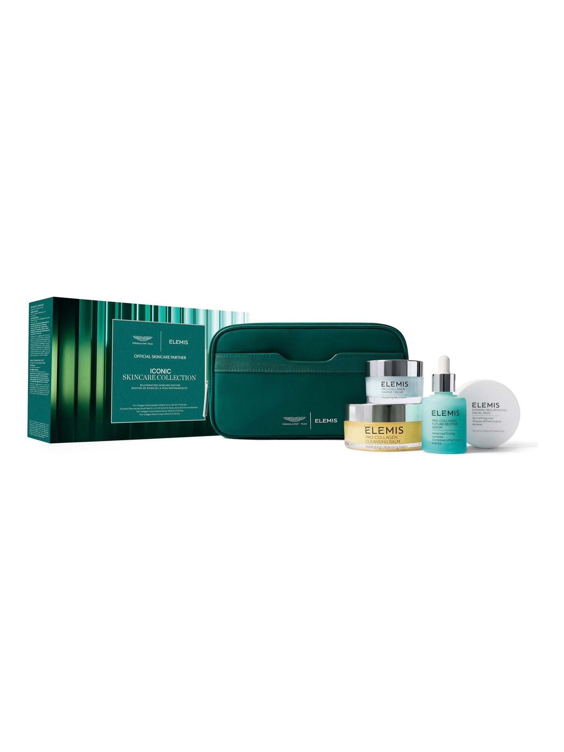 Unlock the rejuvenating power of four performance-driven ELEMIS heroes with this luxury collection, housed in an exclusive travel bag. Created in partnership with the Aston Martin Aramco Formula One™ Team, this limited-edition set unites the ultimate sensorial experience with cutting-edge innovation. Start your routine with the no. 1 British facial cleanser.* Our award-winning 3-in-1 cleansing balm melts away waterproof makeup, strengthens the skin’s barrier, and delivers instant hydration.** The indulgent, transformative texture and our signature blend of 9 essential oils uplifts the senses. Supercharge smoothness and radiance with our Dynamic Resurfacing Facial Pads, infused with our patented † Tri-Enzyme Technology to break down dulling dry skin cell s and reveal a glowing, glass-like complexion. Featuring a world-first marine discovery – our exclusive Opal Skin Algae Complex – Pro-Collagen Future Restore Serum targets the visible effects of collagen decline, improving skin firmness by up to +46% in just 4 days.^ Finish with our iconic, bestselling day cream. Enriched with moisturising Padina Pavonica algae, Pro-Collagen Marine Cream reduces the appearance of fine lines and wrinkles in just 2 weeks, while quenching skin with 24 hours of hydration.†† The silky gel-cream texture glides over the skin, creating the perfect base for makeup. *Source: Circana (UK) Ltd, Retail Tracking Service, Prestige Skincare Facial Cleanser Value and Unit Sales by Franchise, Prestige Brand Classification, 12 Months Ending September 2024. **Independent Clinical Trial 2025. †UK PATENT GB2440117.^Independent Clinical Trials 2024, 30 people over 4 weeks. ††Independent Clinical Trials 2021. Results based on 38 people over 4 weeks.