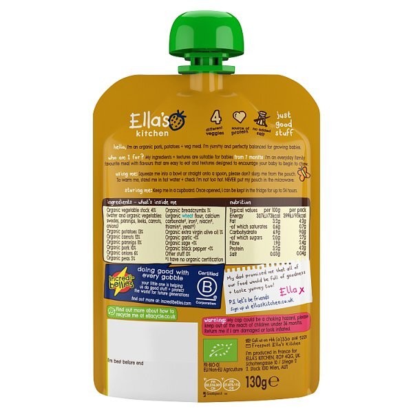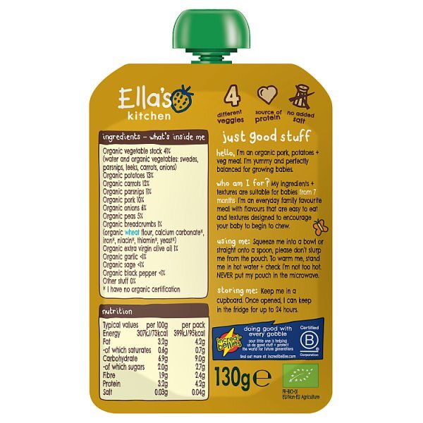 ellas kitchen bangers mash with veggies is a yummy pork potatoes and veg meal for babies produced with 100 organic food the nutritious meal contains no added sugar or salt only contains naturally occurring sugars