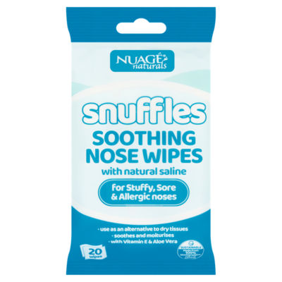 These Nuage Naturals Snuffles are designed to gently cleanse and comfort irritated skin around the nose. Containing natural saline, these wipes offer a mild alternative to dry tissues when dealing with stuffiness or soreness. Each pack contains 20 soft wipes, providing necessary care during times of nasal discomfort.