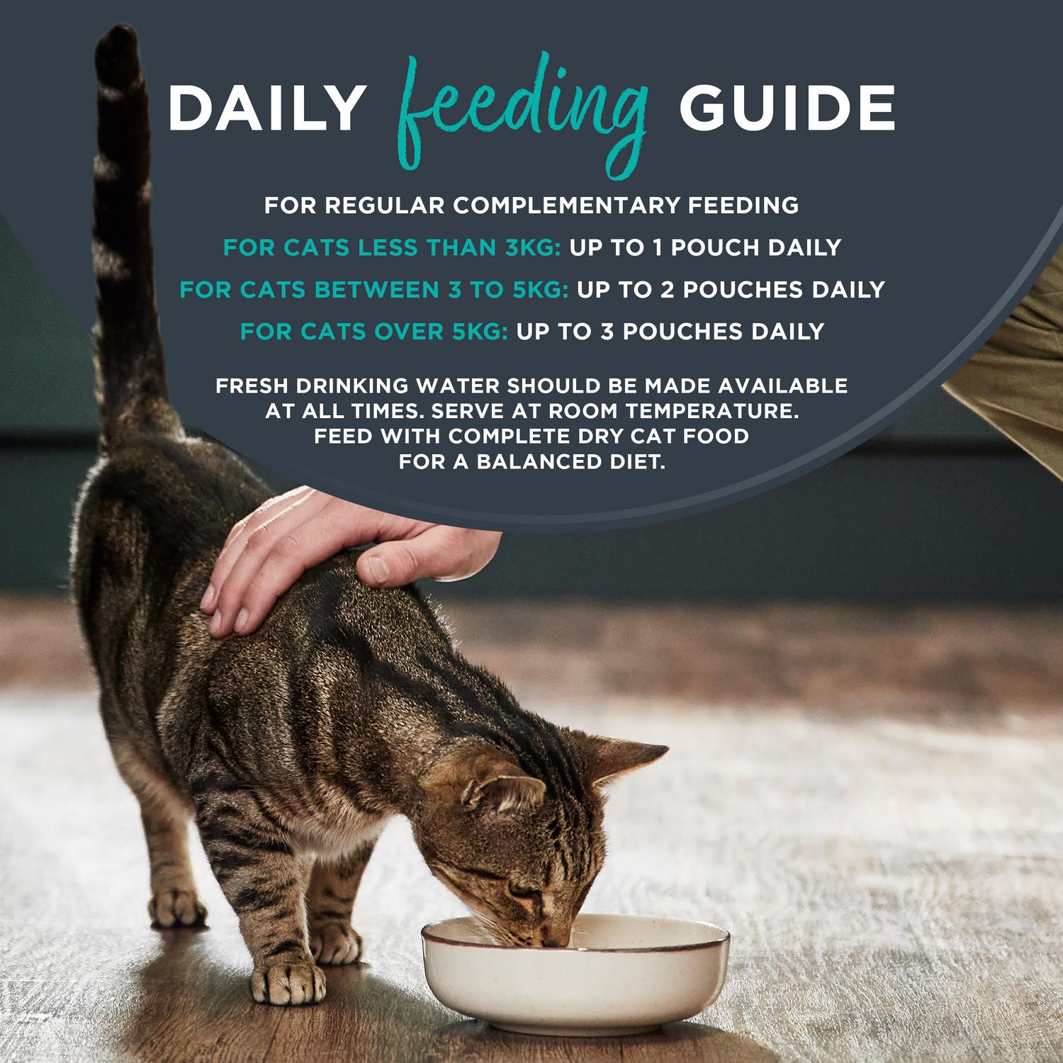 When you want to spoil your cat serve Encore – you can see the difference. Each pouch is filled with 100% natural ingredients and no artificial flavours or additives. Feeding Guide: For regular complementary feeding. For cats less than 3kg: Up to 1 pouch daily. For cats between 3 to 5kg: Up to 2 pouches daily. For cats over 5kg: Up to 3 pouches daily. Fresh drinking water should be made available at all times. Serve at room temperature. Feed with complete dry cat food for a balanced diet. Analytical composition: Protein 14%, Crude Fibre 1%, Crude Fat 1%, Crude Ash 2%, Moisture 82%. Additives: None.