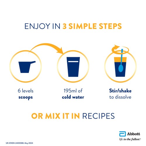 To prepare one 230 ml serving, pour approximately 195 ml of cold water into a glass and gradually add 6 level (a scoop is included in the can) or 53.5 g of Ensure NutriVigor. Stir or shake thoroughly to dissolve the powder.