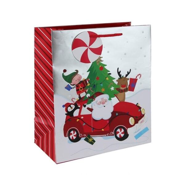 This multipack contains twelve medium-sized Eurowrap gift bags, perfect for handling various presents this season. The festive design prominently features cars alongside characters like Santa, reindeer, and elves. Each unit is built for convenience, incorporating striped carry handles and a swing tag for easy recipient identification.